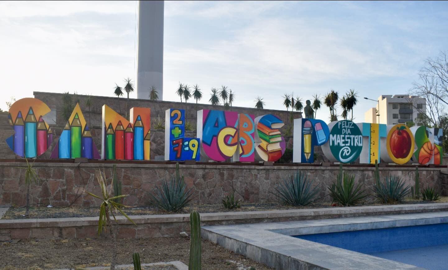 En el marco del Día del Maestro, el Gobierno de la Capital renovó el colorido de las letras monumentales en el asta bandera como un homenaje visual a la labor del magisterio potosino.