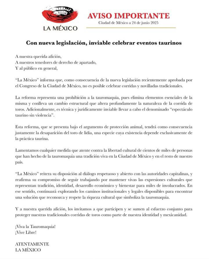 La Plaza de Toros México informó oficialmente la suspensión de todas las corridas de toros y novilladas, en cumplimiento con la nueva ley aprobada por el Congreso que prohíbe estos espectáculos.