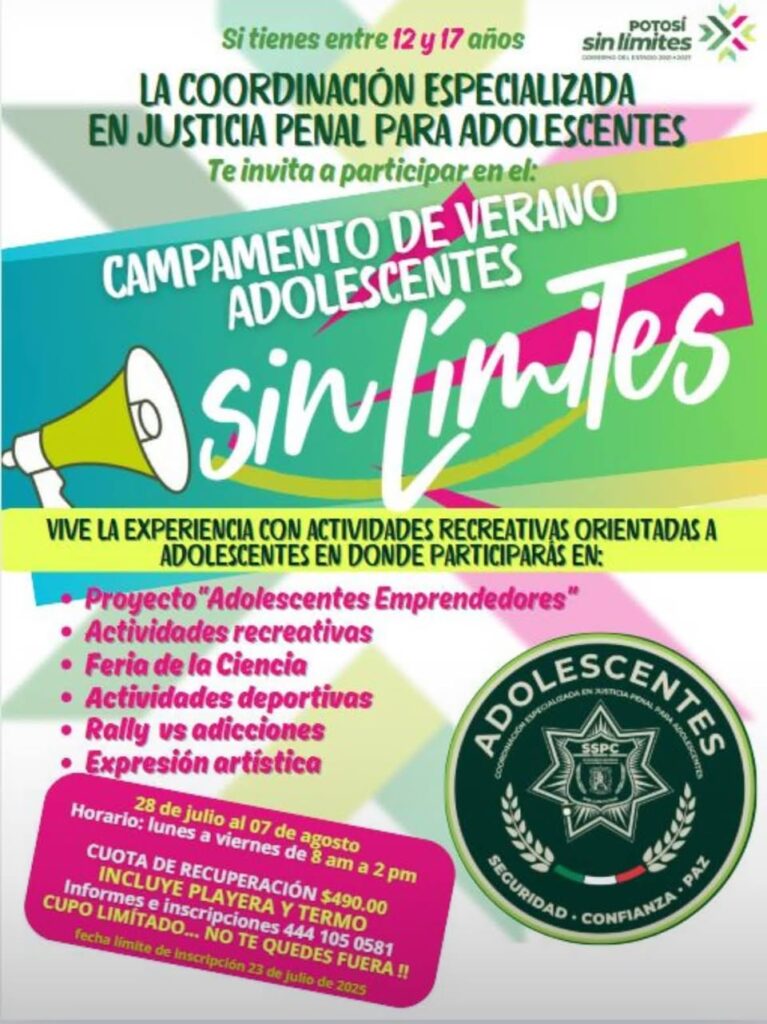 La Secretaría de Seguridad y Protección Ciudadana del Estado, a través del Centro Estatal de Prevención Social y Participación Ciudadana , invita a jóvenes de 12 a 17 años a participar en el Campamento de Verano: Adolescentes Sin Límites, que se realizará del 28 de julio al 7 de agosto.