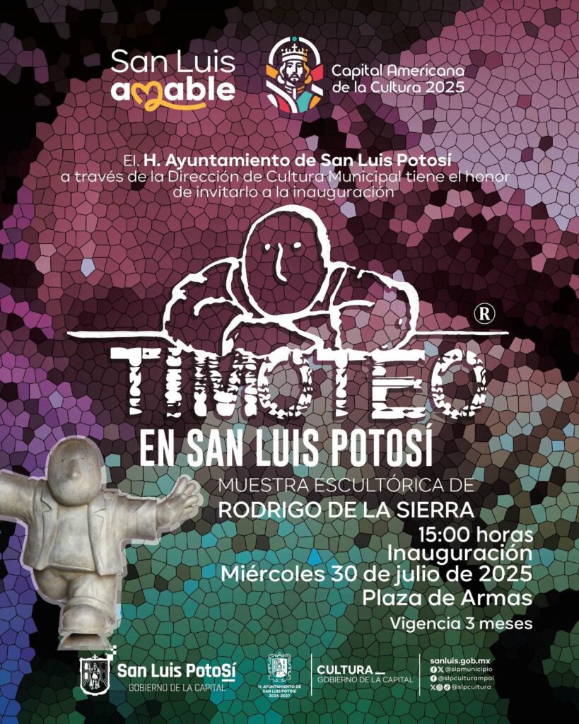 La exposición incluye 15 esculturas del personaje Timoteo, que con humor e ironía invitan a reflexionar sobre la condición humana. La muestra forma parte de las actividades de San Luis Potosí como Capital Americana de la Cultura 2025.
