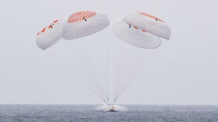 El viaje de regreso incluyó un reingreso a la atmósfera a más de 1,900 °C y la apertura de enormes paracaídas que garantizaron un descenso controlado, la tripulación dos estadounidenses, un ruso y un japonés fue recuperada rápidamente por un barco de SpaceX.