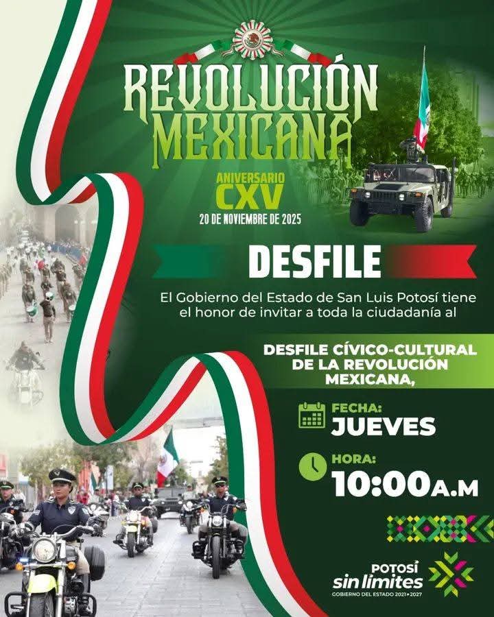 El próximo 20 de noviembre se llevará a cabo el tradicional Desfile de la Revolución Mexicana en las calles de San Luis Potosí, evento que reunirá a familias, instituciones educativas y agrupaciones culturales en una celebración llena de historia y tradición.Las autoridades locales invitaron a la ciudadanía a participar en este recorrido conmemorativo, que busca recordar a los héroes y heroínas que lucharon por la justicia, la libertad y el México moderno, el desfile contará con carros alegóricos, presentaciones artísticas y representaciones alusivas al movimiento revolucionario.El llamado es a disfrutar de un ambiente festivo donde se destaca el orgullo nacional, reforzando los valores cívicos y la importancia de mantener vivas las raíces históricas del país.El evento está abierto al público y se espera una alta asistencia de familias que año con año participan en esta conmemoración. #ResetMedia #PotosíSinLímites #CulturaSinLímites #CulturaSLP #SecretaríadeCulturaSLP