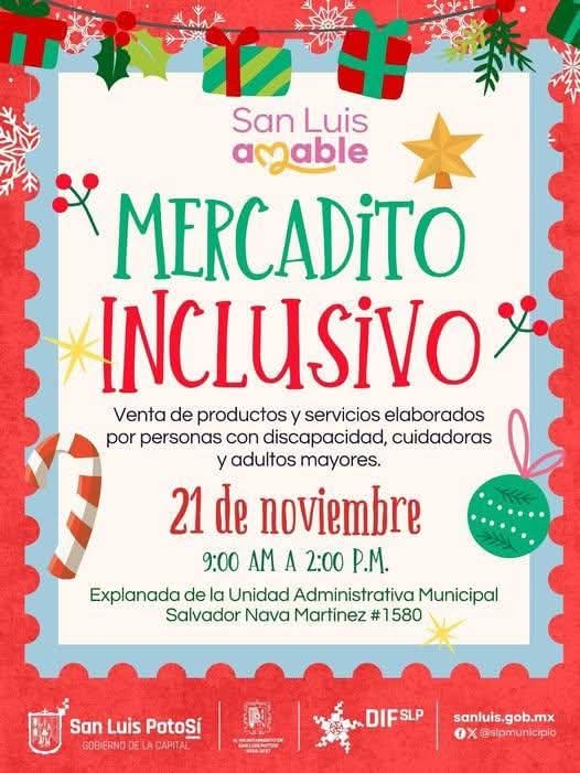 El Sistema Municipal DIF de San Luis Potosí llevará a cabo este viernes 21 de diciembre el Mercadito Inclusivo, un espacio destinado a impulsar el trabajo y talento de personas con discapacidad, personas cuidadoras y adultos mayores.La presidenta del DIF Capitalino, Estela Arriaga Márquez, destacó que este proyecto busca fortalecer la autonomía económica de quienes participan, al ofrecer un lugar donde puedan dar a conocer sus productos y servicios, señaló que cada compra representa un apoyo directo para mejorar su calidad de vida.El evento se realizará en la explanada de la Unidad Administrativa Municipal, en Salvador Nava Martínez #1580, con horario de 9:00 de la mañana a 2:00 de la tarde, las y los asistentes podrán encontrar artesanías, repostería, manualidades, regalos y diversos servicios elaborados por integrantes del programa.#ResetMedia #DIFMunicipal #MercaditoInclusivo #SanLuisPotosí #Inclusión #SLP