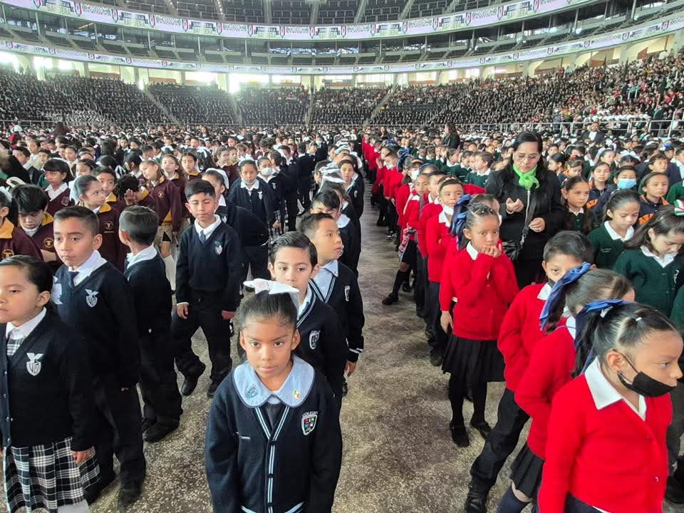 En una ceremonia multitudinaria celebrada en la Arena Potosí, miles de estudiantes potosinos protagonizaron el tradicional Juramento a la Bandera, acto cívico encabezado por el Secretario de Educación de Gobierno del Estado, Juan Carlos Torres Cedillo, con la presencia de autoridades de los tres órdenes de gobierno.El evento reunió a alumnas y alumnos de diversas preparatorias, de la Benemérita y Centenaria Normal del Estado, así como a estudiantes de tercer grado de primaria de distintas instituciones educativas, quienes cada año encabezan el acto de abanderamiento como parte de su formación cívica.En esta edición participaron 128 escuelas, de las cuales 60 son oficiales y 68 particulares, congregando a 4 mil 524 alumnas y alumnos de tercer grado. Además, asistieron 384 directivos y docentes, junto con miles de madres, padres de familia y ciudadanía en general que atestiguaron este significativo momento.Durante el acto protocolario se destacó que la bandera nacional sintetiza la historia, las luchas y los anhelos del pueblo mexicano, al tiempo que representa la pluralidad cultural y la fortaleza de una nación que avanza con determinación. A las y los estudiantes se les recordó que jurar lealtad no es un acto simbólico aislado, sino la asunción de un compromiso que los vincula con la memoria histórica y con el futuro del país.#ResetMedia#JuramentoALaBandera#estudiantespotosinos#DiaDeLaBandera